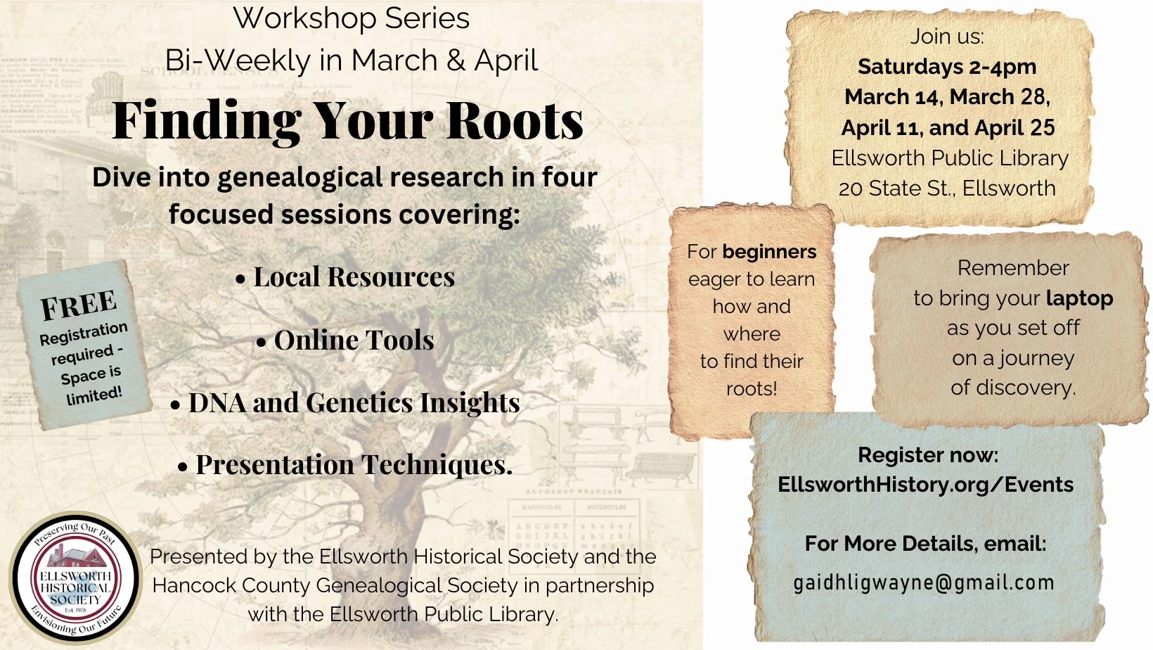 Dr. Wayne Smith is reprising his (free) genealogical research workshop in collaboration with Hancock County Genealogical Society and the Ellsworth Public Library (see poster attached). This workshop aims to help beginners on their journey to finding their roots. The sessions are from 2 to 4 p.m. Saturdays in March and April. Those dates are: March 14, March 28, April 11, and April 25. There is limited enrollment (seating). Those wishing to enroll should contact Dr. Smith at gaidhligwayne@gmail.com.